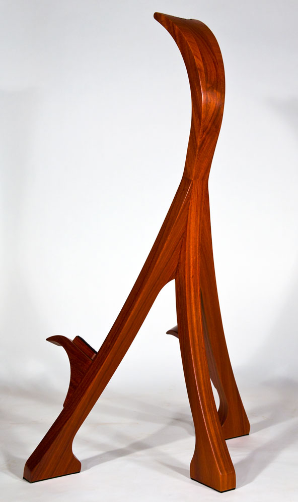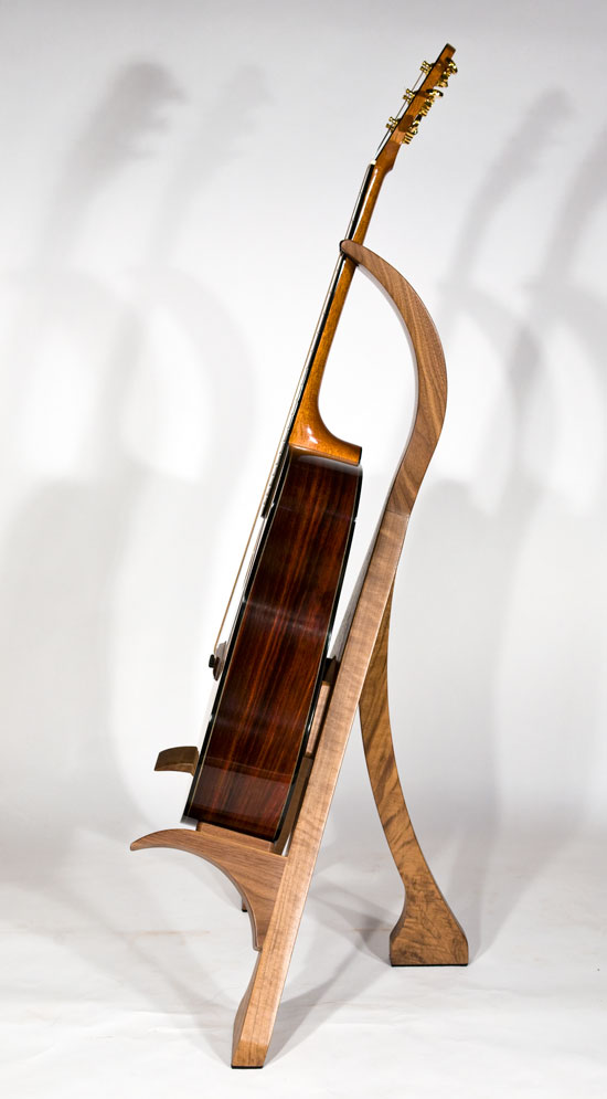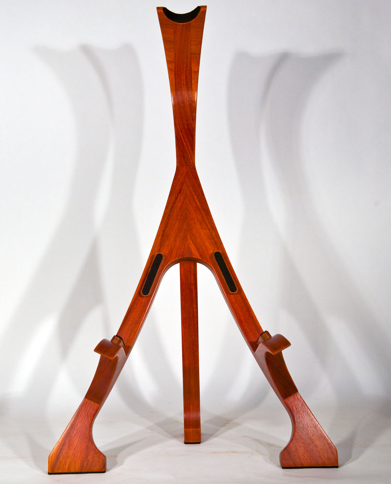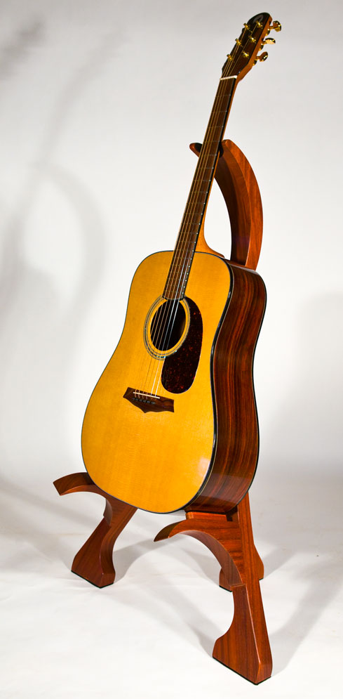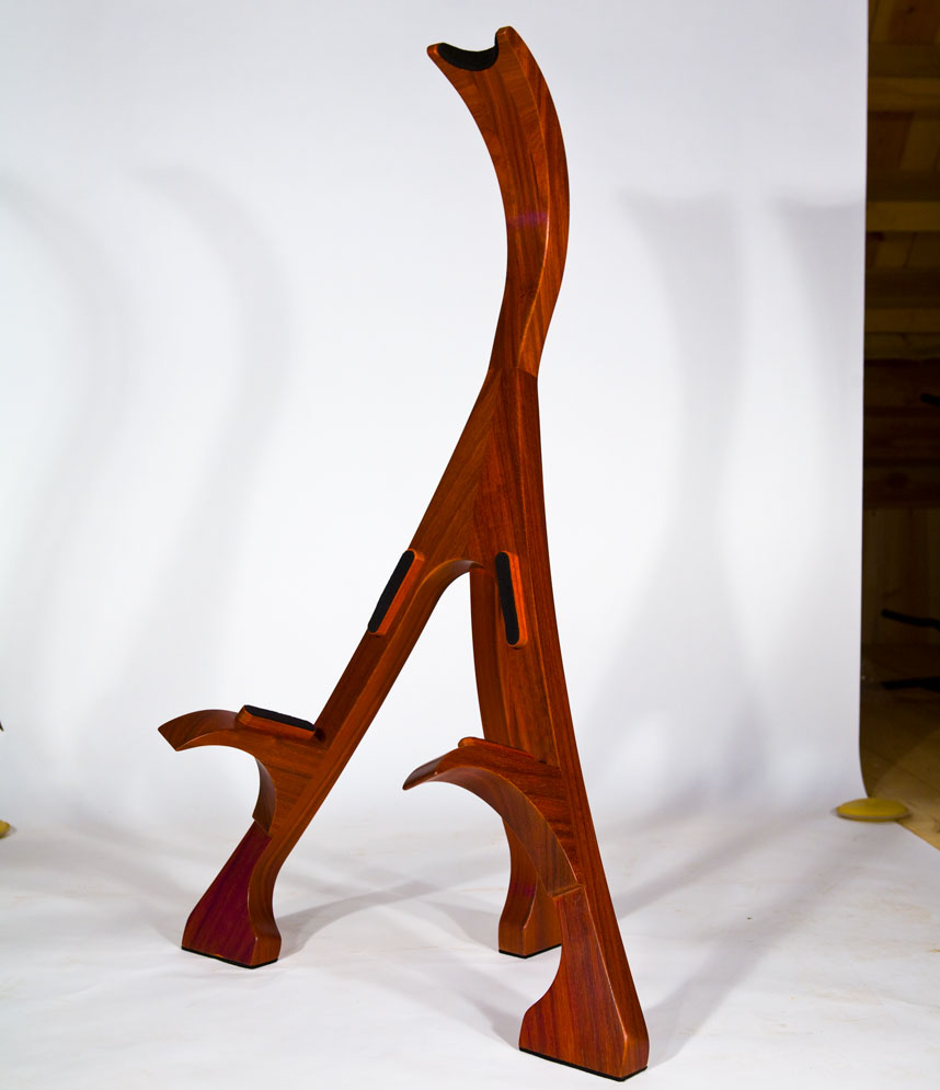As a complement to your handcrafted Lone Wolf Guitar, I also offer handcrafted guitar stands. These stands are not designed to be collapsible gig stands, but instead are designed as an elegant piece of furniture for your house to attractively display your guitar. My stands are made from 2 inch (8/4) thick solid hardwood lumber (no veneers), using many of the same types of exotic wood as my guitars. Using wood in this dimension accentuates the beauty of the wood and provides the heft needed for solid and stable stand. To protect the finish of the guitar, thick felt padding is used on all areas that contact the guitar. Because of the substantial amount of wood used in my stands, the price depends on the hardwoods used. A standard white ash stand retails for $375 (plus shipping). More expensive woods will increase the cost proportionately. The stands are shipped fully assembled.