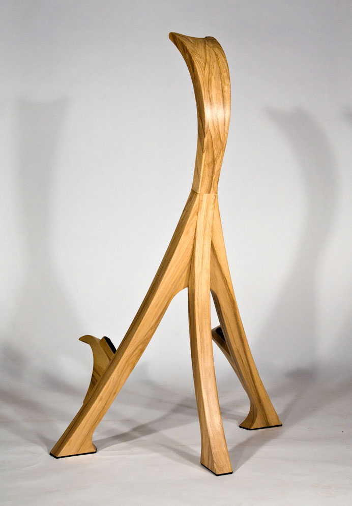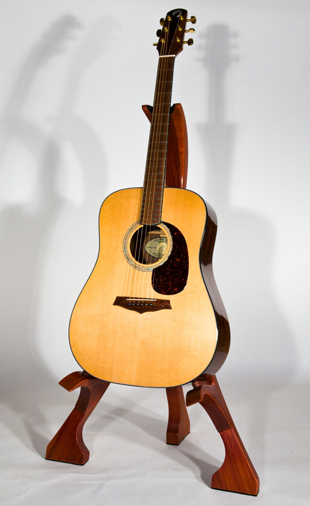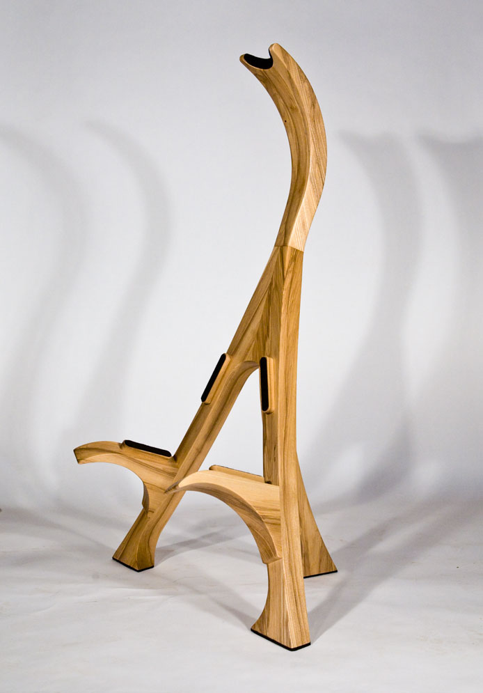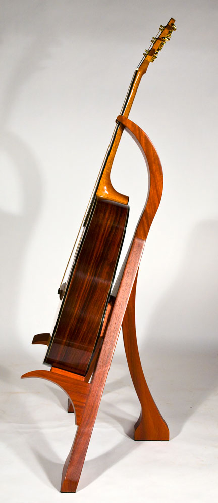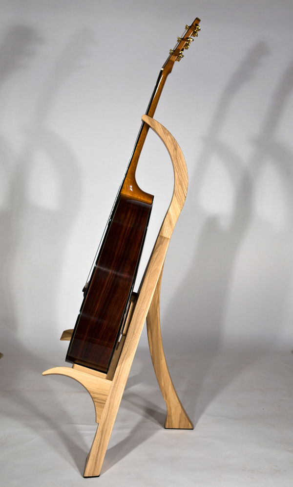 As a complement to your handcrafted Lone Wolf Guitar, I also offer handcrafted guitar stands. These stands are not designed to be collapsible gig stands, but instead are designed as an elegant piece of furniture for your house to attractively display your guitar. My stands are made from 2 inch (8/4) thick solid hardwood lumber (no veneers), using many of the same types of exotic wood as my guitars. Using wood in this dimension accentuates the beauty of the wood and provides the heft needed for solid and stable stand. To protect the finish of the guitar, thick felt padding is used on all areas that contact the guitar. Because of the substantial amount of wood used in my stands, the price depends on the hardwoods used. A standard white ash stand retails for $375 (plus shipping). More expensive woods will increase the cost proportionately. The stands are shipped fully assembled.